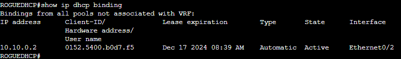 Le port du serveur « ROGUE_DHCP » ne dispose pas de la commande ip dhcp snooping trust, ses paquets DHCP seront supprimés.