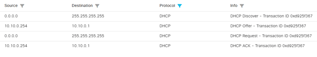Ci-dessous, voici un échange classique d’une attribution d’adresse IP via DHCP.